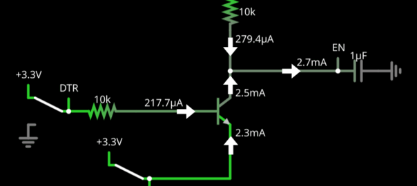 First, we flip the RTS switch. This results in DTR having a higher electrical potential than RTS, and thus some current flowing from the base (B) to the emitter (E). The transistor itself lowers the potential by about 0.6V, so the current coming from B is about (3.3V – 0.6V) / 10kΩ = 270µA.